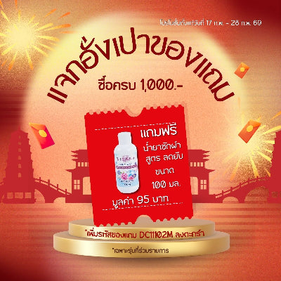 ตรุษจีนนี้มีแต่เฮง ทั้งลด ทั้งแถม เมื่อซื้อสินค้าครบ 1,000 บาท (เฉพาะสินค้ารุ่นที่ร่วมรายการ) รับฟรี น้ำยาซักผ้า สูตร ลดรอยยับ ขนาด 100 มล. มูลค่า 95 บาท